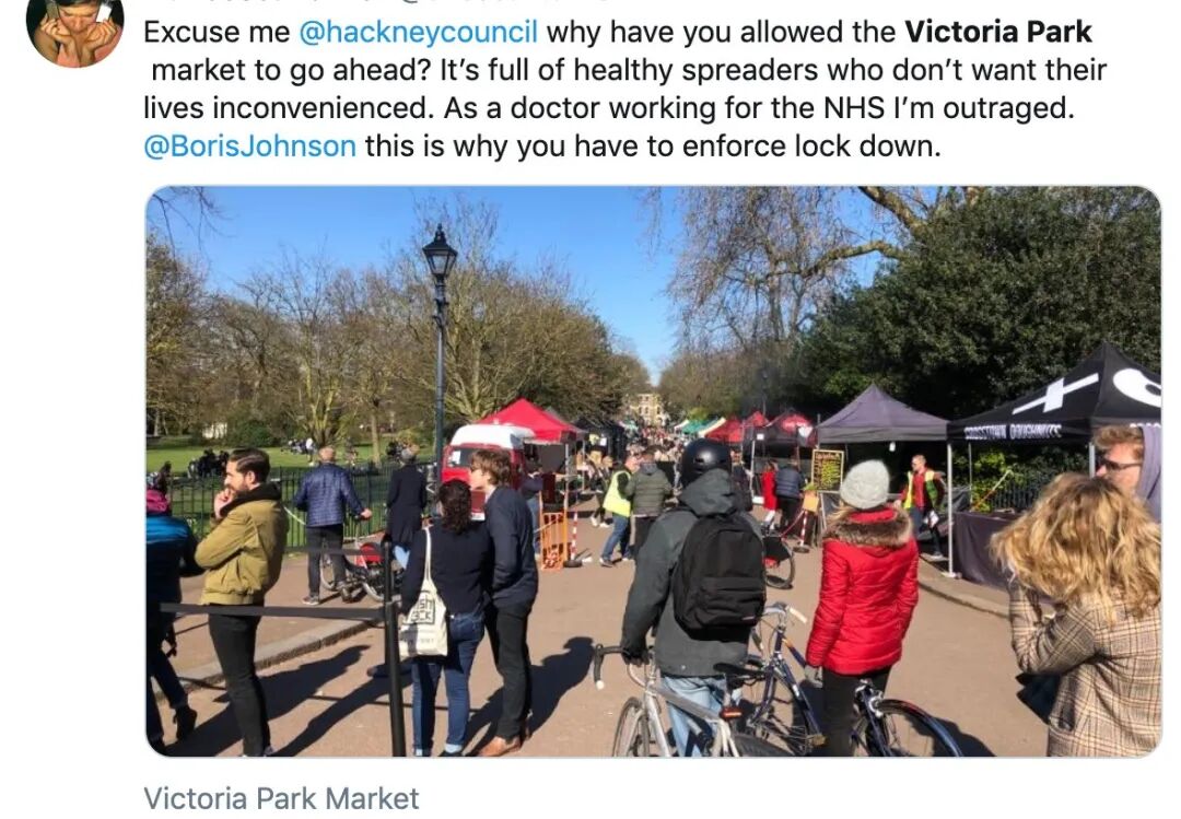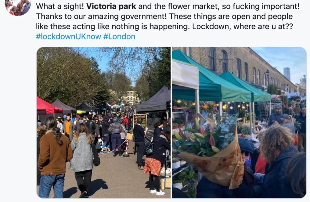 由此引发大量网民在推特上质疑,并要求英国政府实施封锁:“为什么允许维多利亚公园集市开放…….作为一名NHS的医生,我非常愤怒,鲍里斯,看到了吗这就是为什么必须实行封锁。”