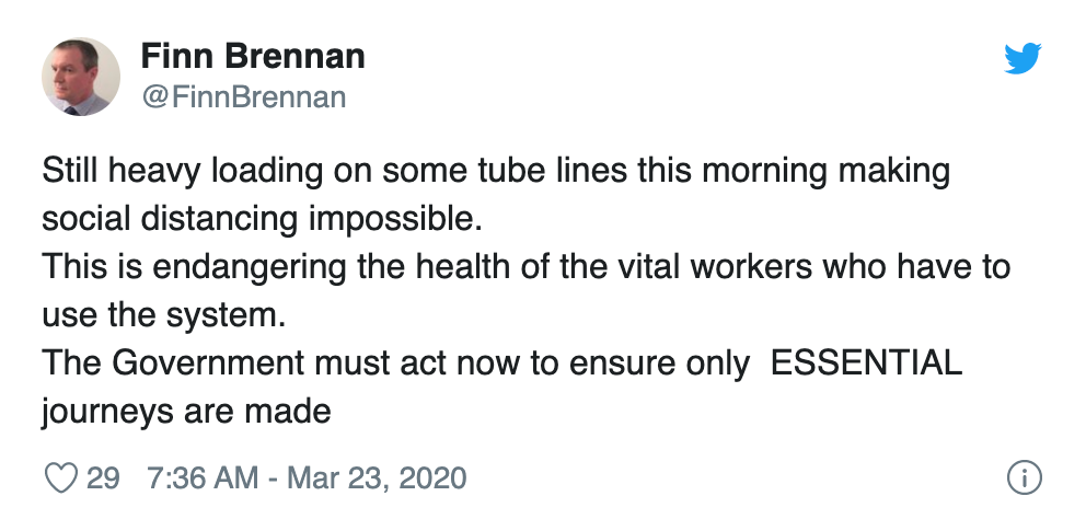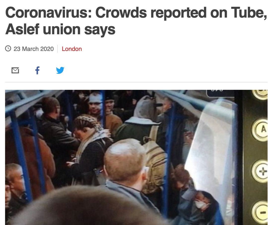 一位机车工程师和消防员协会(ASLEF)今早在推特上写道:“今天早上,某些地铁线仍然非常拥挤,这使得保持社交距离变得完全不可能。这危及到必须使用地铁的重要工作人员的健康。政府现在必须行动起来,确保只允许必要的旅行。”