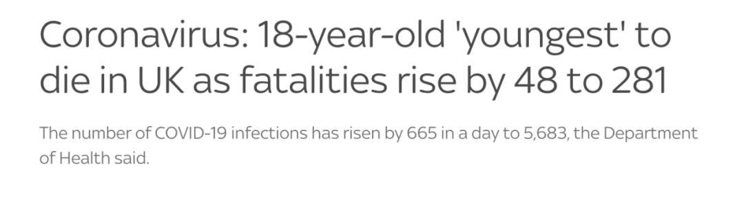 在目前英国的死亡病例中,最大年纪为102岁,最小年龄的死者年仅18岁,系目前为止英国年纪最小的因新冠肺炎逝世的患者,二人生前皆患有基础疾病。