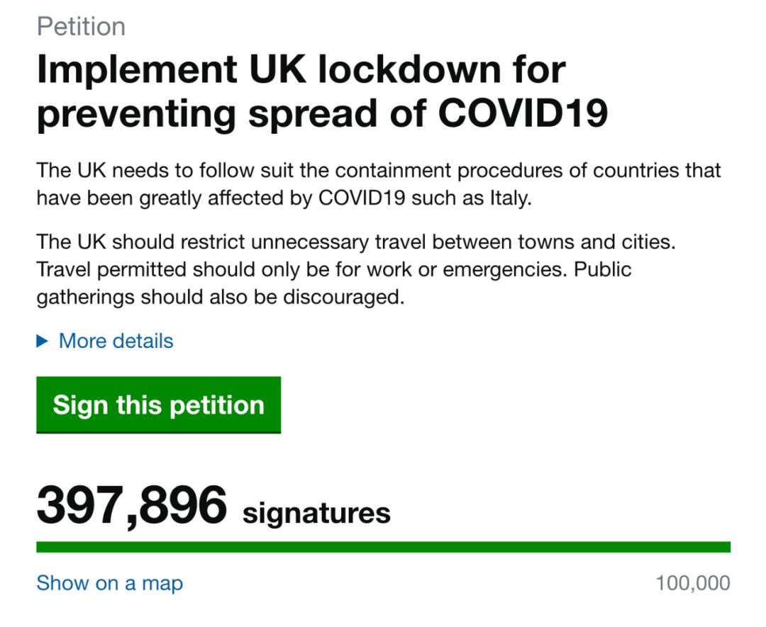 当然很多英国民众也有这样的相同诉求,在向英国政府请愿的网站上,已经超过39万人签名,要求英国政府全面封锁来抑制病毒传播。