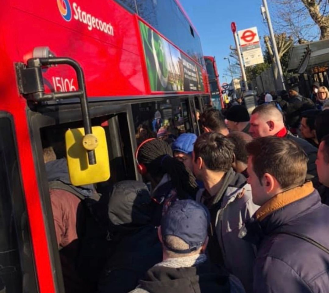 (今早Stratford的一辆公交车站,挤满了乘车的人)