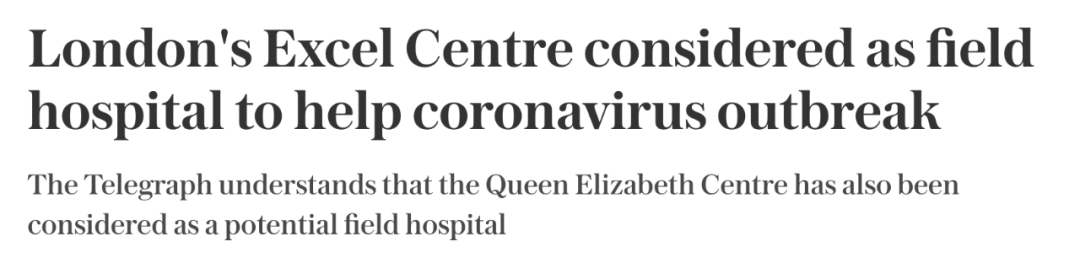 另一个好消息:据电讯报报道,为了增大救助能力,位于东伦敦的ExCel英国国际会展中心,可能将被改造为方舱医院,以救治新冠肺炎病患。