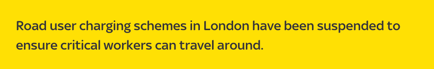 据今日最新消息:伦敦的‘道路使用者收费计划’已经暂停,以便抗疫中重要的工作人员出行便利。