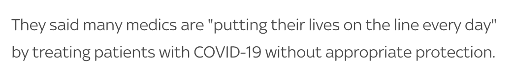 天空新闻台也在今日的报道中同样提到:许多医护人员“每天都在冒着生命危险”,在没有恰当保护的情况下治疗新冠肺炎患者。